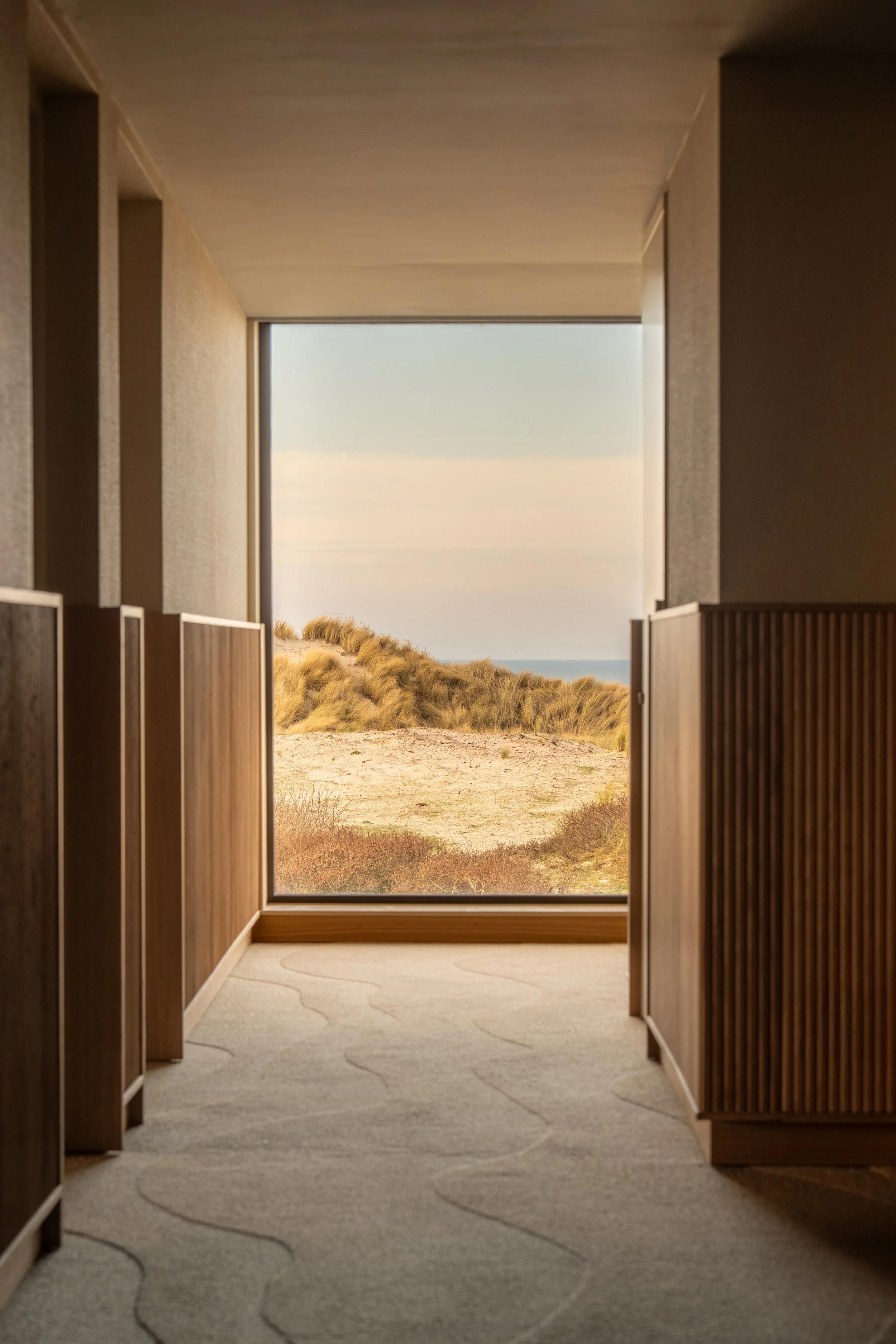 Zichtlijnen naar zee en duin zijn maximaal benut. Houten portalen verbergen techniek en zorgen tegelijk voor een intieme sfeer. Ruw beton, Belgisch linnen, lokaal wol en maatwerkmeubilair smelten samen tot een ingetogen luxe.
