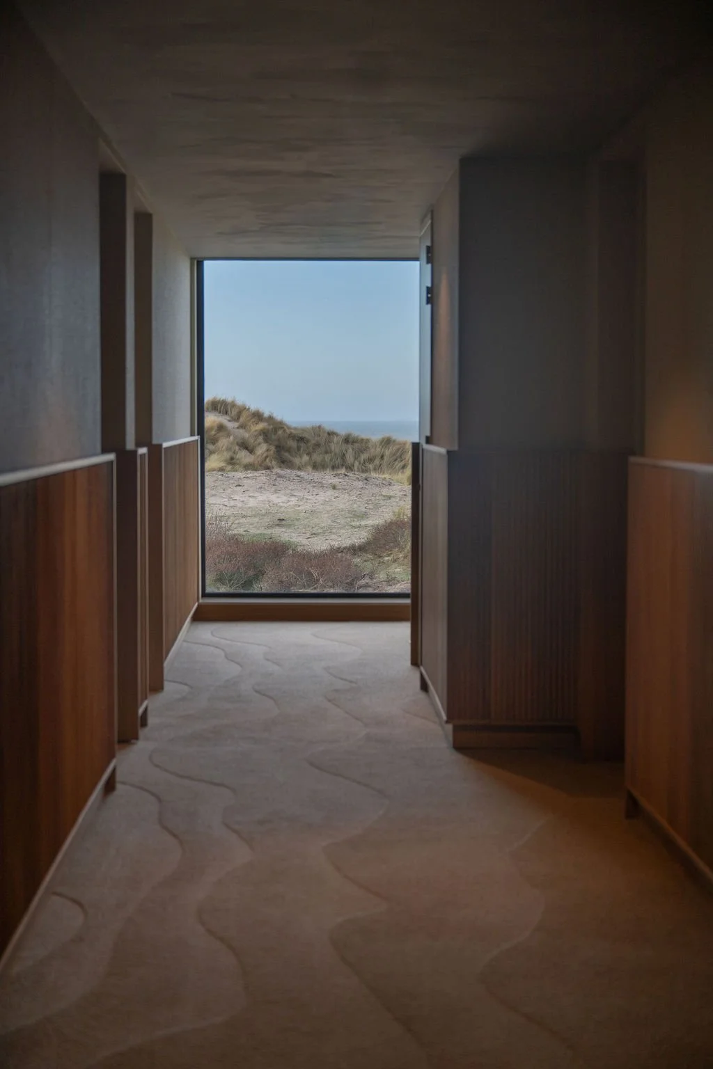 Zichtlijnen naar zee en duin zijn maximaal benut. Houten portalen verbergen techniek en zorgen tegelijk voor een intieme sfeer. Ruw beton, Belgisch linnen, lokaal wol en maatwerkmeubilair smelten samen tot een ingetogen luxe.